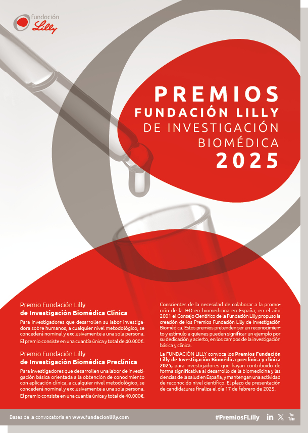 La Fundación Lilly convoca los Premios Fundación Lilly de Investigación Biomédica Preclínica y Clínica 2025 para investigadores que contribuyan de forma significativa al desarrollo de la biomedicina y las ciencias de la salud en España, y mantengan una actividad investigadora de reconocido nivel científico.